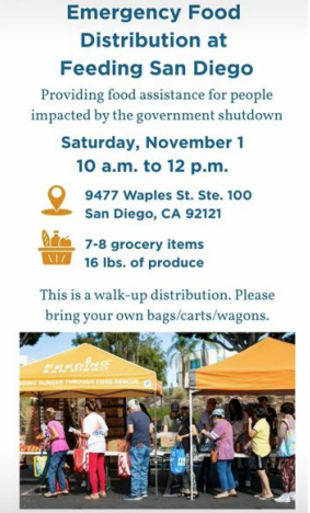 Feeding San Diego will host a free, large-scale food distribution Saturday, November 1, from 10 a.m. to 12 p.m.