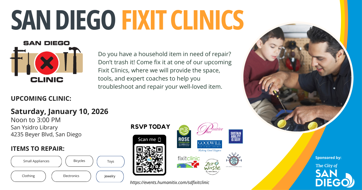 Fix your broken items for free, and learn new skills. Join the San Diego Fixit Clinic at the San Ysidro Library on Saturday, January 10th, from noon to 3:00 PM. Bring the whole family and learn to fix your stuff together. First come, first served! Learn how to: • Fix broken appliances and gadgets • … Continued