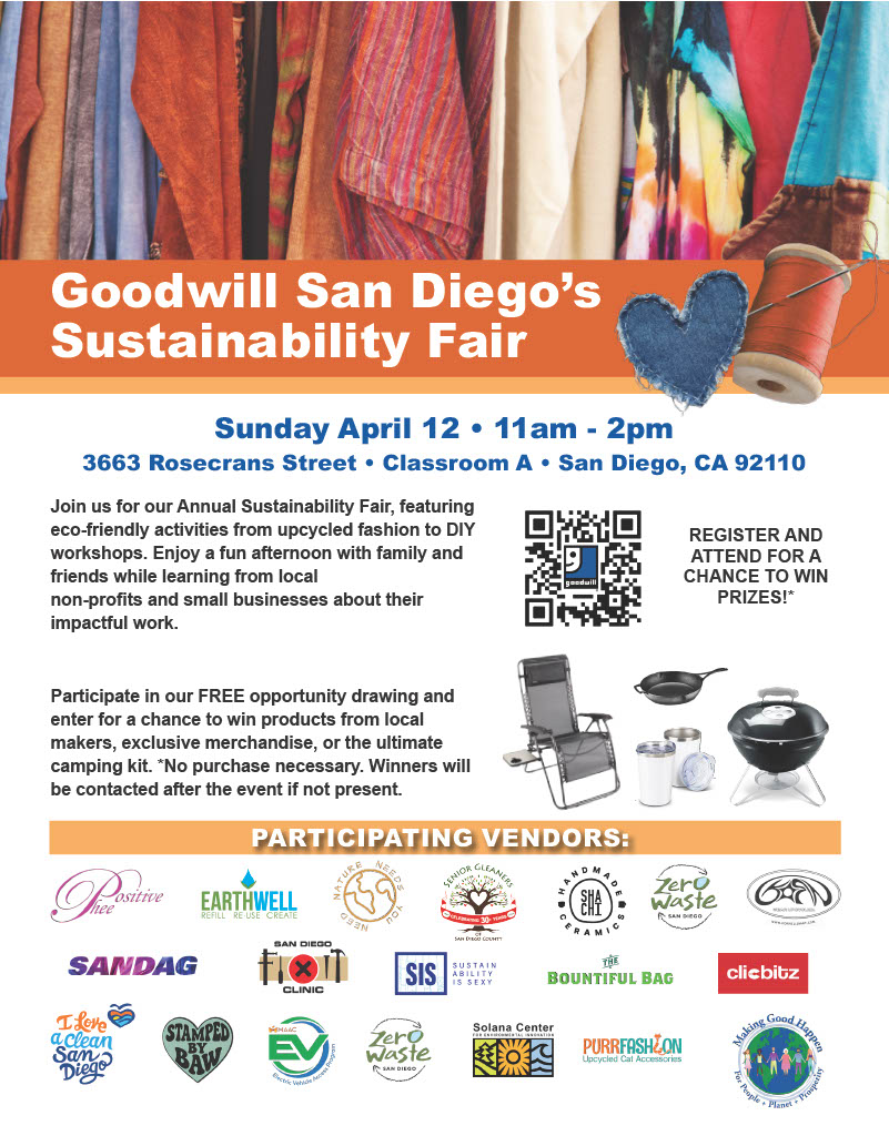 Come join us at the Sustainability Fair hosted by local 501(c)3 non-profit Goodwill San Diego in Classroom A at 3663 Rosecrans Street! This event is all about promoting sustainable practices and eco-friendly living. From … Continued