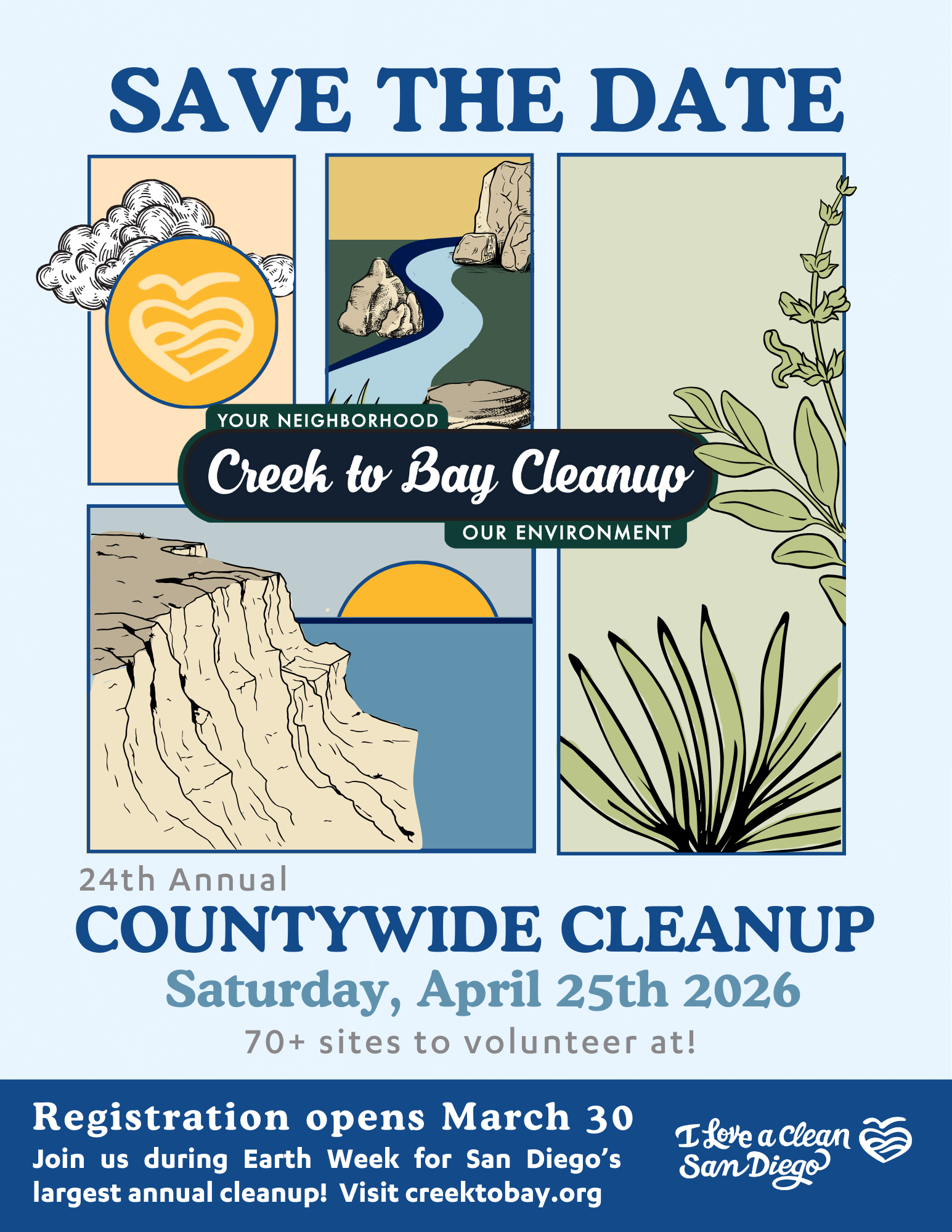 Make a difference this Earth Day at the Annual Creek to Bay Cleanup! Join over 5,000 volunteers at 100+ sites from Julian to the coast in San Diego County’s largest earth week cleanup. Help remove litter and debris from your community and be part of a county-wide effort to protect our planet.